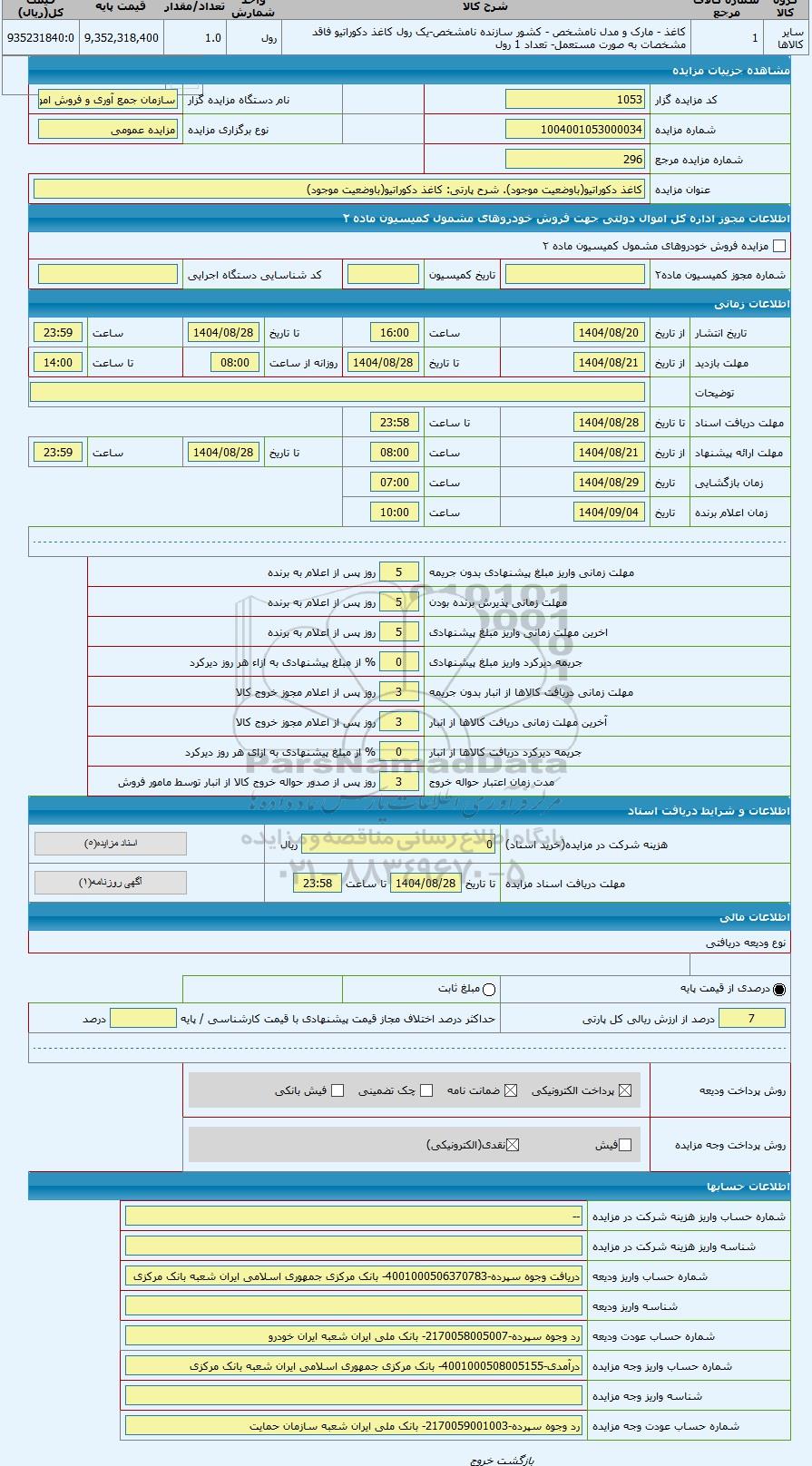 تلفن:5- 88349670 (021) فکس: 88349673 (021) Website: www.ParsNamadData.com E-mail: Info@ParsNamadData.com مزایده کاغذ دکوراتیو(باوضعیت موجود)