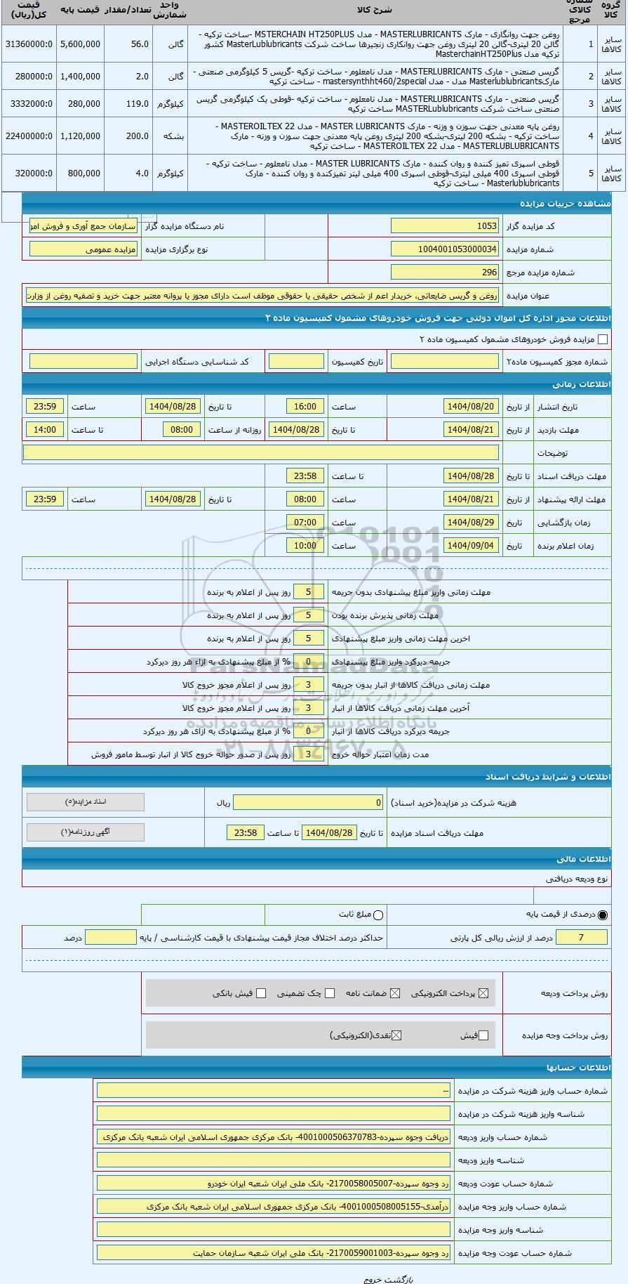 | سایر کالاها | 1 | روغن جهت روانگاری - مارک MASTERLUBRICANTS - مدل MSTERCHAIN HT250PLUS -ساخت ترکیه - گالن 20 لیتری-گالن 20 لیتری روغن جهت روانکاری زنجیرها ساخت شرکت MasterLublubricants کشور ترکیه مدل MasterchainHT250Plus | گالن | 56.0 | 5,600,000 | 31360000:0 | | سایر کالاها | 2 | گریس صنعتی - مارک MASTERLUBRICANTS - مدل نامعلوم - ساخت ترکیه -گریس 5 کیلوگرمی صنعتی - مارکMasterlublubricants مدل - مدل mastersynthht460/2special - ساخت ترکیه | گالن | 2.0 | 1,400,000 | 280000:0 | | سایر کالاها | 3 | گریس صنعتی - مارک MASTERLUBRICANTS - مدل نامعلوم - ساخت ترکیه -قوطی یک کیلوگرمی گریس صنعتی ساخت شرکت MASTERLublubricants ساخت ترکیه | کیلوگرم | 119.0 | 280,000 | 3332000:0 | | سایر کالاها | 4 | روغن پایه معدنی جهت سوزن و وزنه - مارک MASTER LUBRICANTS - مدل MASTEROILTEX 22 - ساخت ترکیه - بشکه 200 لیتری-بشکه 200 لیتری روغن پایه معدنی جهت سوزن و وزنه - مارک MASTERLUBLUBRICANTS - مدل MASTEROILTEX 22 - ساخت ترکیه | بشکه | 200.0 | 1,120,000 | 22400000:0 | | سایر کالاها | 5 | قوطی اسپری تمیز کننده و روان کننده - مارک MASTER LUBRICANTS - مدل نامعلوم - ساخت ترکیه - قوطی اسپری 400 میلی لیتری-قوطی اسپری 400 میلی لیتر تمیزکنده و روان کننده - مارک Masterlublubricants - ساخت ترکیه | کیلوگرم | 4.0 | 800,000 | 320000:0 |