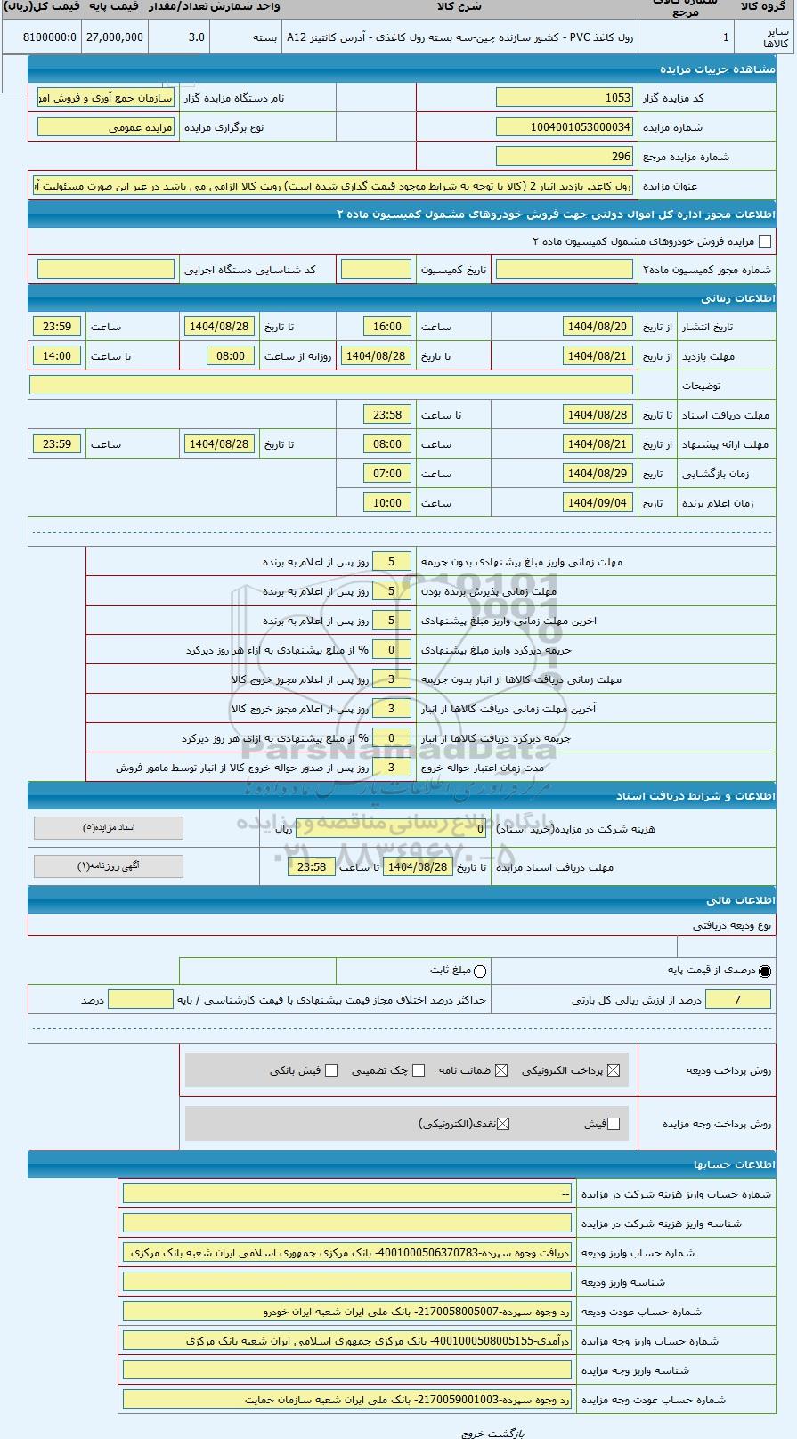 تلفن:5- 88349670 (021) فکس: 88349673 (021) Website: www.ParsNamadData.com E-mail: Info@ParsNamadData.com مزایده رول کاغذ. بازدید انبار 2 (کالا با توجه به شرایط موجود قیمت گذاری شده است) رویت کالا الزامی می باشد در غیر این صورت مسئو