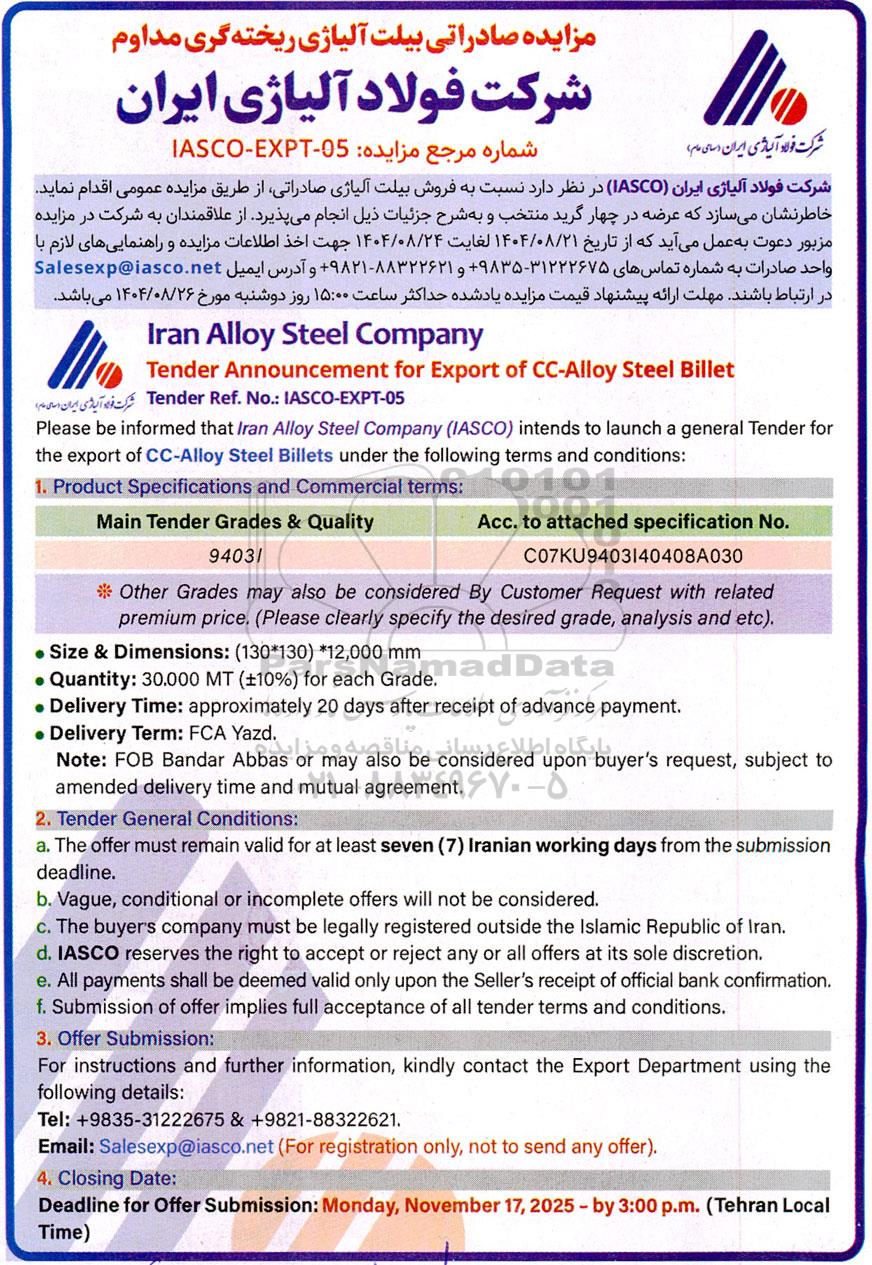 شرکت فولاد آلیاژی ایران (IASCO) در نظر دارد نسبت به فروش بیلت آلیاژی صادراتی ، از طریق مزایده عمومی اقدام نماید. خاطرنشان می سازد که عرضه در چهار گرید منتخب و به شرح جزئیات ذیل انجام می پذیرد. از علاقه مندان به شرکت در مزایده مزبور دعوت به عمل می آید که از تاریخ 1404.08.21 لغایت 1404.08.24 جهت اخذ اطلاعات مزایده و راهنمایی های لازم با واحد صادرات به شماره تماس های 31222675 - 9835 + و 88322621 - 9821 + و آدرس ایمیل Salesexp@iasco.ir در ارتباط باشند. مهلت ارائه پیشنهاد قیمت مزایده یاد شده حداکثر ساعت 15:00 روز دوشنبه مورخ 1404.08.26 می باشد.