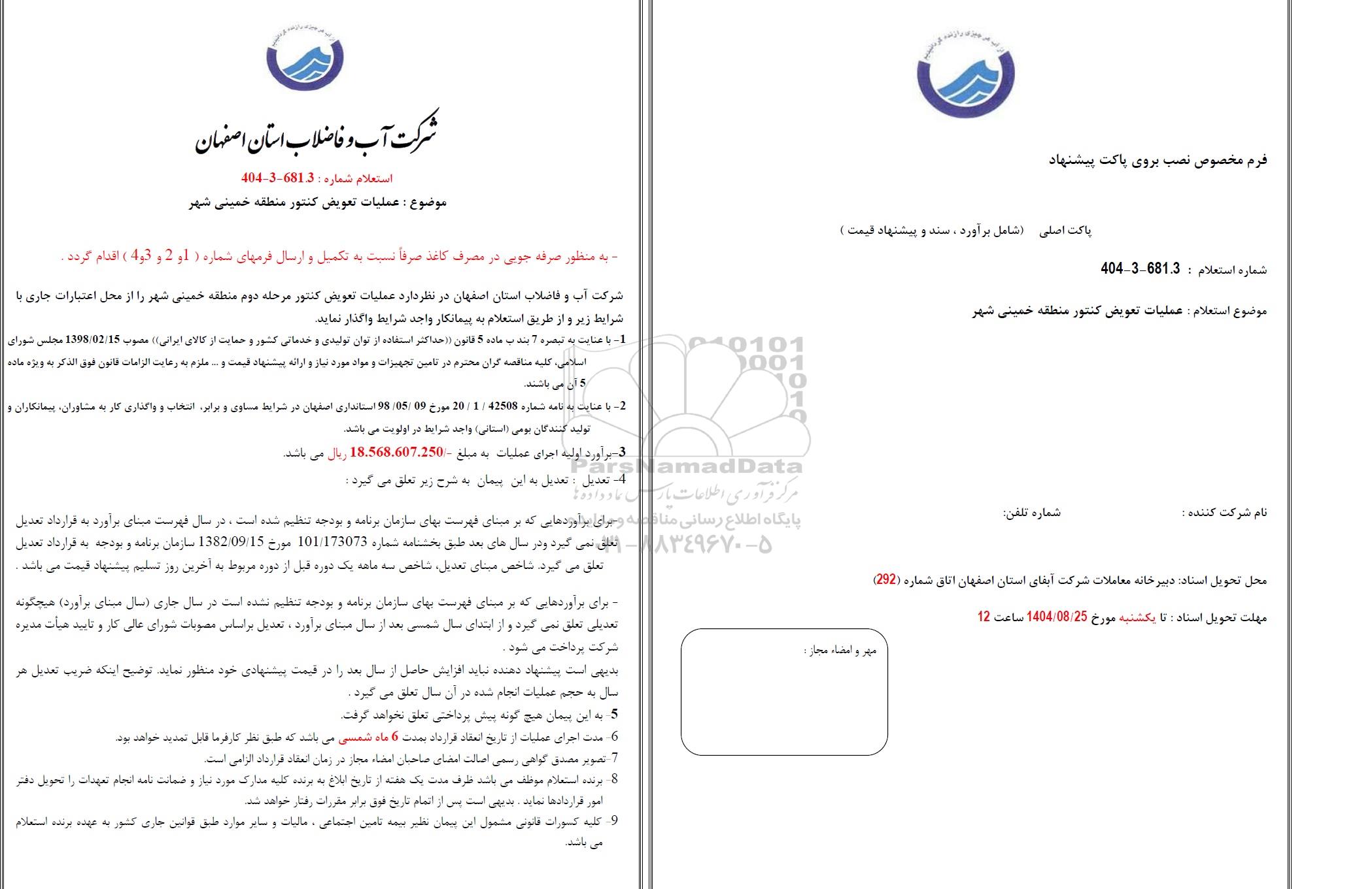 شرکت آب و فاضلاب استان اصفهان در نظر دارد عملیات تعویض کنتور مرحله دوم منطقه خمینی شهر را از محل اعتبارات جاری با شرایط زیر و از طریق استعلام به پیمانکار واجد شرایط واگذار نماید.