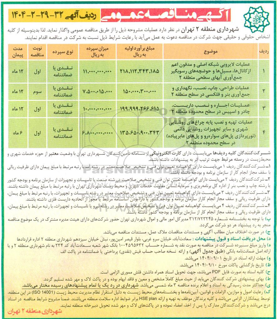 شهرداری منطقه 2 تهران در نظر دارد عملیات مشروحه ذیل را از طریق مناقصه عمومی واگذار نماید. لذا بدینوسیله از کلیه اشخاص حقوقی و حقیقی جهت شرکت در مناقصه دعوت به عمل می آید با رعایت شرایط ذیل نسبت به شرکت در مناقصه اقدام نمایند.