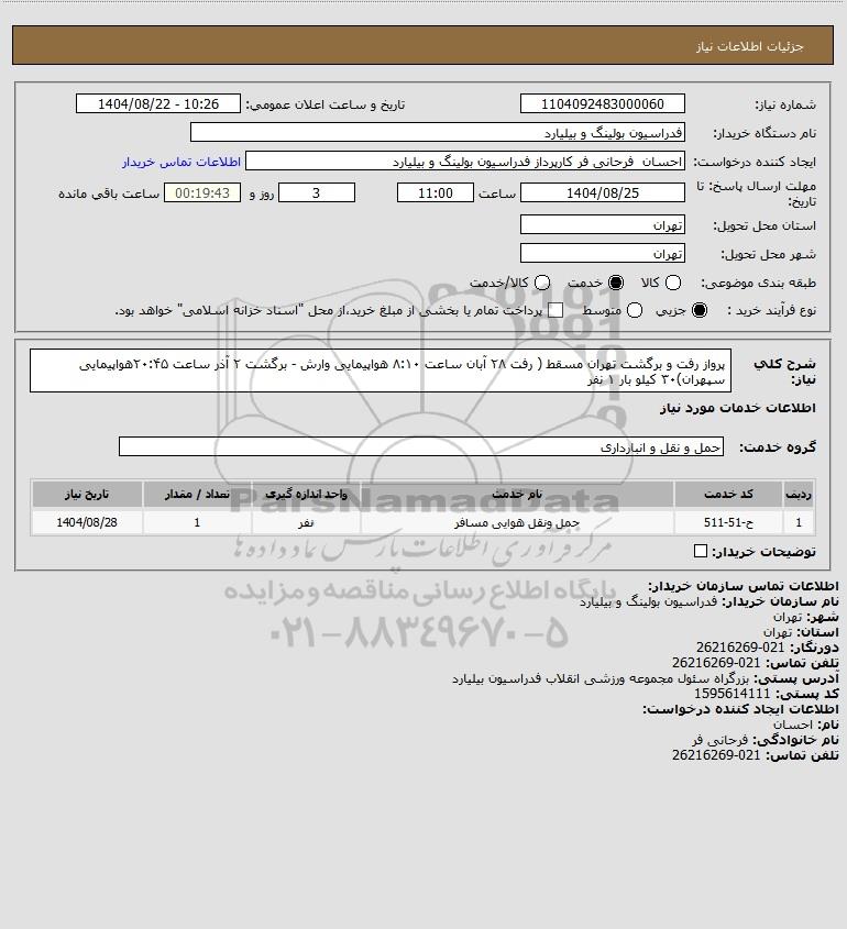 تلفن:5- 88349670 (021) فکس: 88349673 (021) Website: www.ParsNamadData.com E-mail: Info@ParsNamadData.com استعلام پرواز رفت و برگشت تهران مسقط ( رفت ۲۸ آبان ساعت ۸:۱۰ هواپیمایی وارش - برگشت ۲ آذر ساعت ۲۰:۴۵هواپیمایی سپهران)۳۰ کیلو بار ۱ نفر