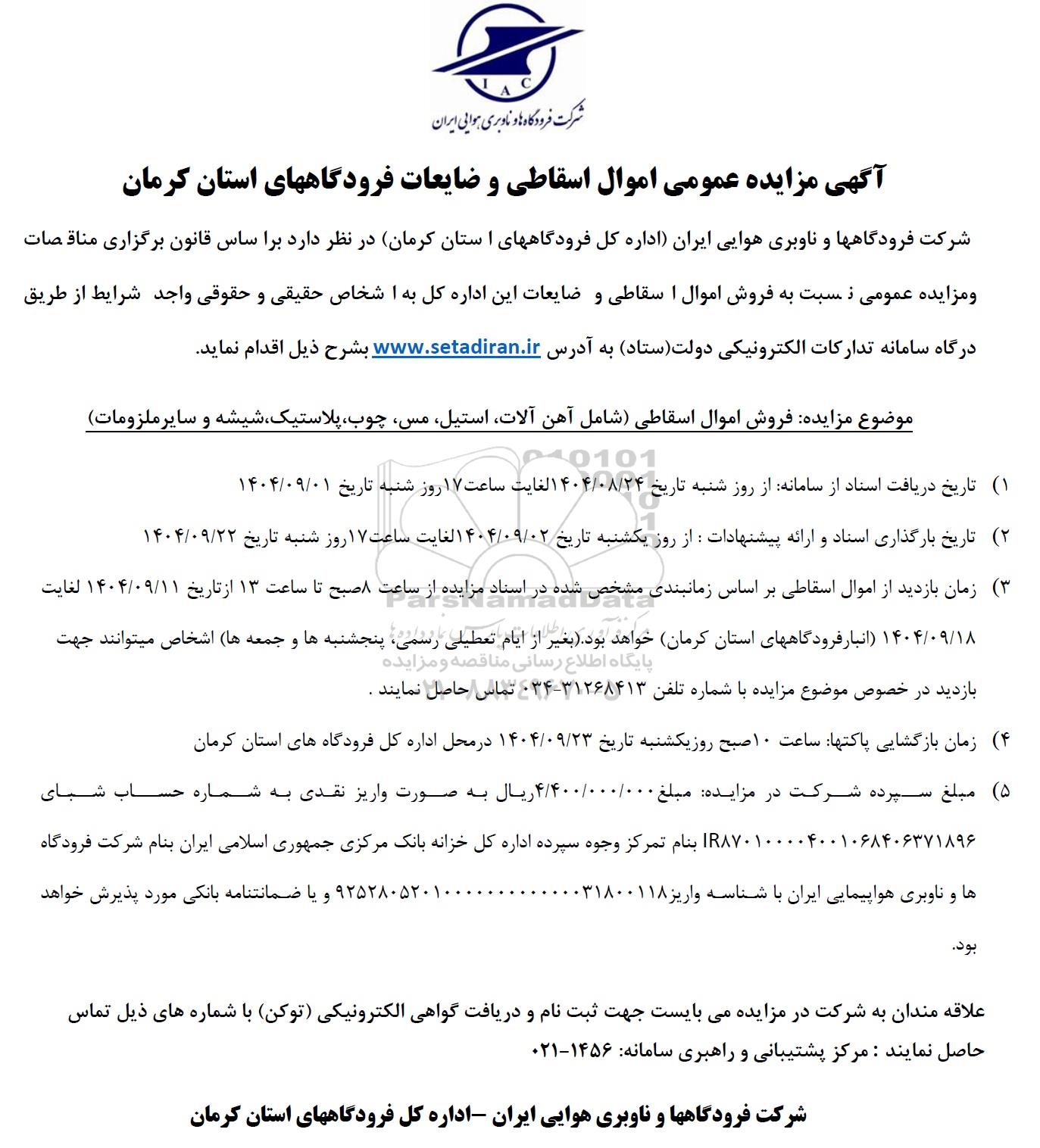آگهی مزایده عمومی اموال اسقاطی و ضایعات فرودگاههای استان کرمان