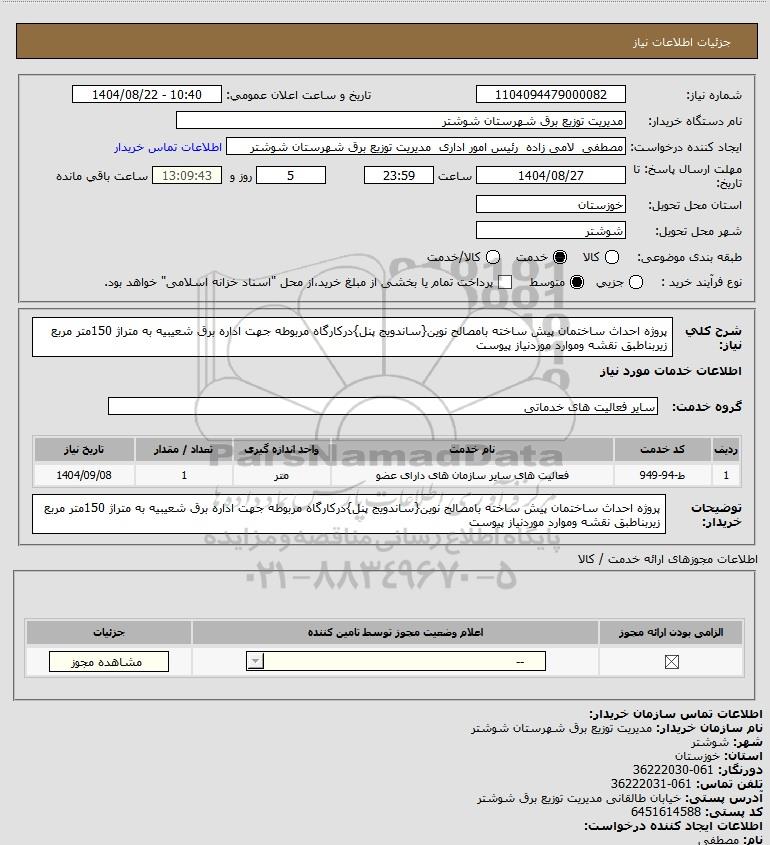 تلفن:5- 88349670 (021) فکس: 88349673 (021) Website: www.ParsNamadData.com E-mail: Info@ParsNamadData.com استعلام پروژه احداث ساختمان پیش ساخته بامصالح نوین{ساندویج پنل}درکارگاه مربوطه جهت اداره برق شعیبیه به متراژ 150متر مربع زیربناطبق نقشه وموارد موردنیاز پیوست
