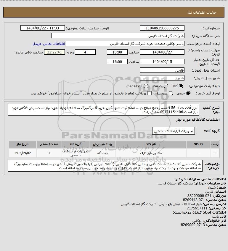 تلفن:5- 88349670 (021) فکس: 88349673 (021) Website: www.ParsNamadData.com E-mail: Info@ParsNamadData.com استعلام ابزار آلات تعداد 56 قلم.سرجمع مبالغ در سامانه ثبت شود.فایل خرید 6 برگ.برگ سامانه مودیان مورد نیاز است.پیش فاکتور مورد نیاز است.09171154406 صادق زاده.