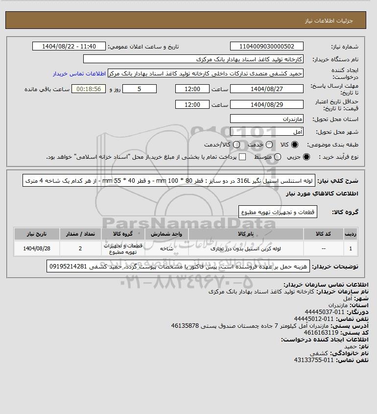 تلفن:5- 88349670 (021) فکس: 88349673 (021) Website: www.ParsNamadData.com E-mail: Info@ParsNamadData.com استعلام لوله استنلس استیل نگیر 316L در دو سایز : قطر 80 * 100 mm - و قطر 40 * 55 mm - از هر کدام یک شاخه 4 متری
