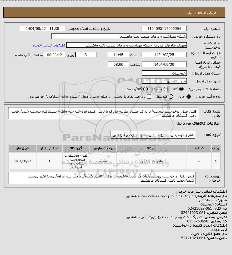 تلفن:5- 88349670 (021) فکس: 88349673 (021) Website: www.ParsNamadData.com E-mail: Info@ParsNamadData.com استعلام فلش طبق درخواست پیوست/ایران کد مشابه/هزینه باربری با تامین کننده/پرداخت سه ماهه/ پیشفاکتور پیوست شود/اولویت تامین کنندگان ماهشهر
