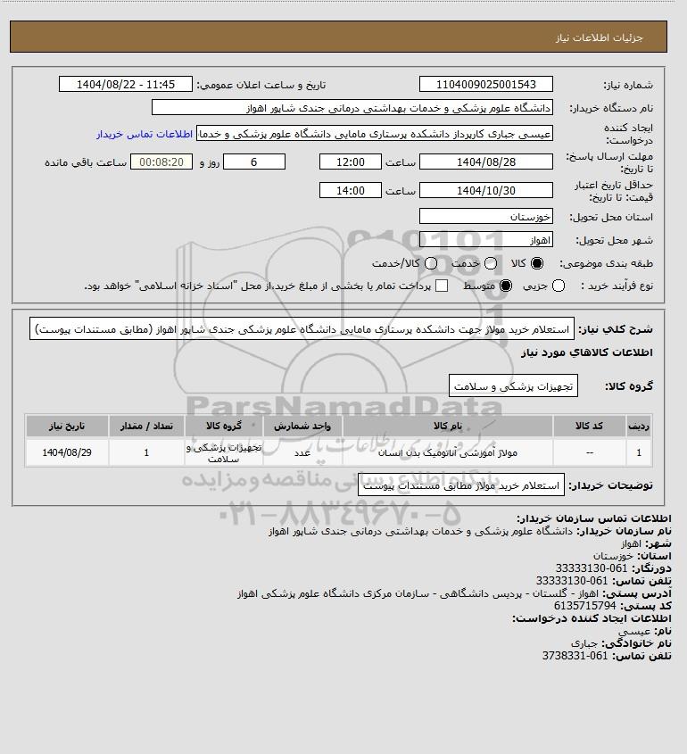 تلفن:5- 88349670 (021) فکس: 88349673 (021) Website: www.ParsNamadData.com E-mail: Info@ParsNamadData.com استعلام استعلام خرید مولاژ جهت دانشکده پرستاری مامایی دانشگاه علوم پزشکی جندی شاپور اهواز (مطابق مستندات پیوست)