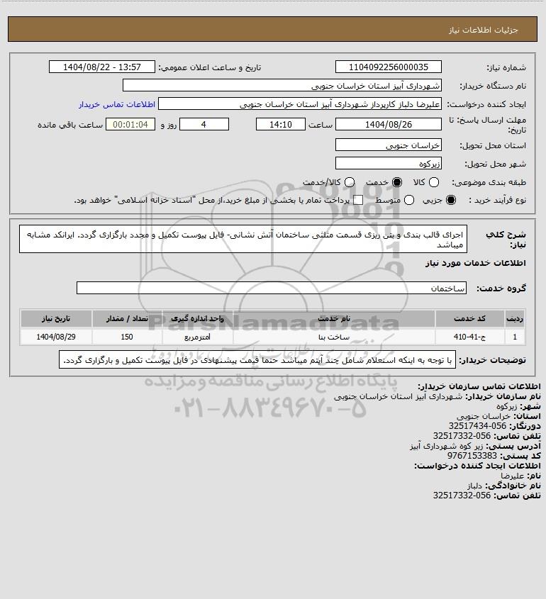 تلفن:5- 88349670 (021) فکس: 88349673 (021) Website: www.ParsNamadData.com E-mail: Info@ParsNamadData.com استعلام اجرای قالب بندی و بتن ریزی قسمت مثلثی ساختمان آتش نشانی- فایل پیوست تکمیل و مجدد بارگزاری گردد. ایرانکد مشابه میباشد