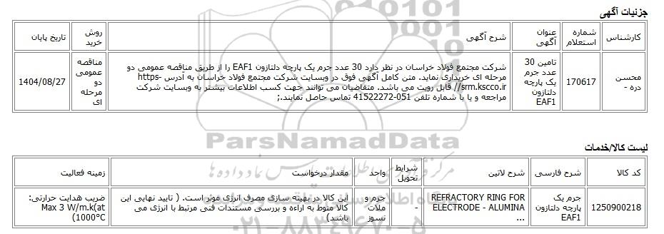 محسن دره - 170617تامین 30 عدد جرم یک پارچه دلتازون EAF1شرکت مجتمع فولاد خراسان در نظر دارد 30 عدد جرم یک پارچه دلتازون EAF1 را از طریق مناقصه عمومی دو مرحله ای خریداری نماید. متن کامل آگهی فوق در وبسایت شرکت مجتمع فولاد خراسان به آدرس https-//srm.kscco.ir قابل رویت می باشد. متقاضیان می توانند جهت کسب اطلاعات بیشتر به وبسایت شرکت مراجعه و یا با شماره تلفن 051-41522272 تماس حاصل نمایند.;مناقصه عمومی دو مرحله ای1404/08/27