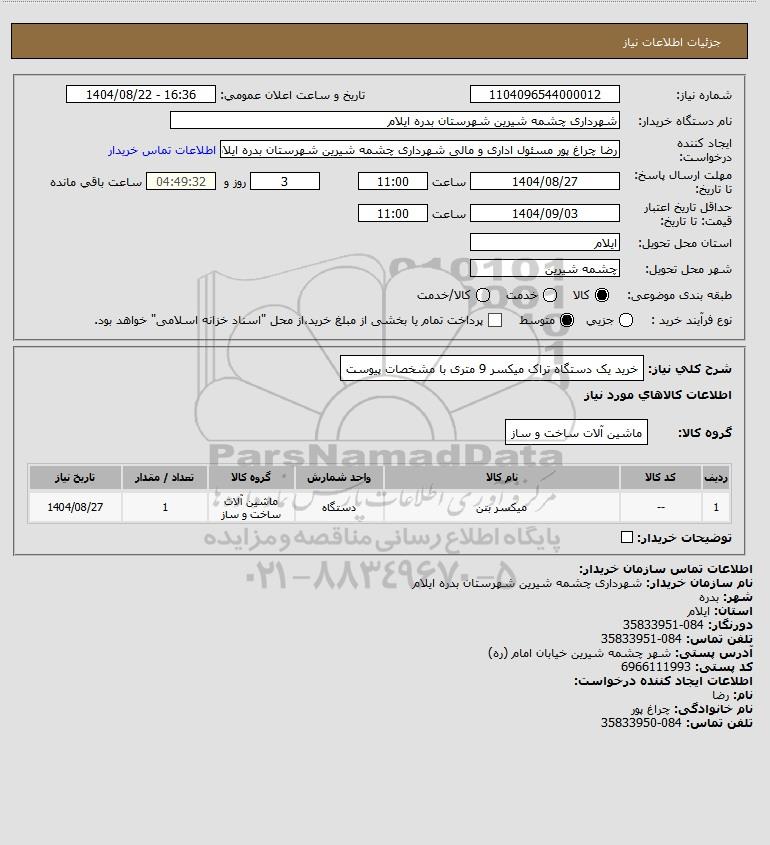 تلفن:5- 88349670 (021) فکس: 88349673 (021) Website: www.ParsNamadData.com E-mail: Info@ParsNamadData.com استعلام خرید یک دستگاه تراک میکسر 9 متری با مشخصات پیوست