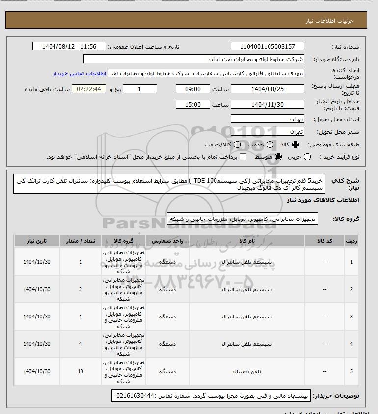 تلفن:5- 88349670 (021) فکس: 88349673 (021) Website: www.ParsNamadData.com E-mail: Info@ParsNamadData.com استعلام خرید5 قلم تجهیزات مخابراتی (کی سیستم100 TDE ) مطابق شرایط استعلام پیوست