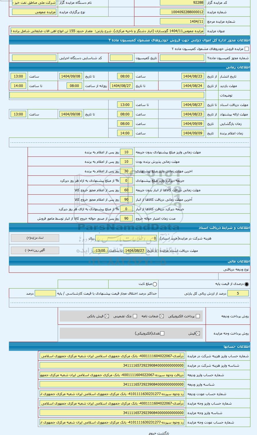 تلفن:5- 88349670 (021) فکس: 88349673 (021) Website: www.ParsNamadData.com E-mail: Info@ParsNamadData.com مزایده مقدار حدود 155 تن انواع اهن الات ضایعاتی شامل براده اهن استیل چدن و ورقهای مخازن و بشکه های فرسوده فلزی و ورقهای الوم