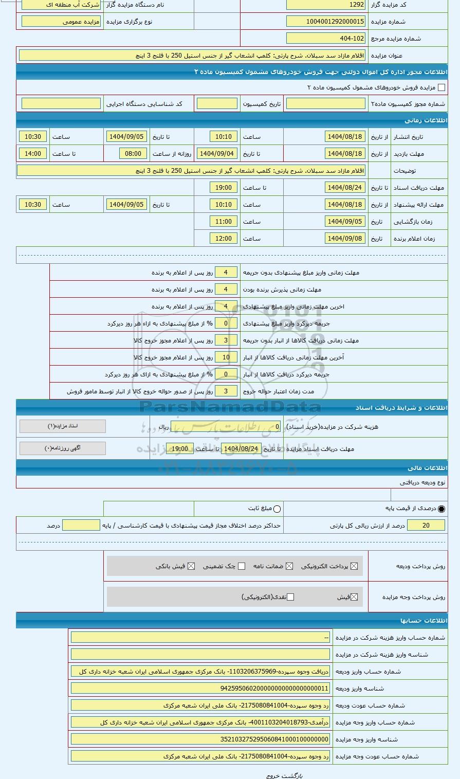 تلفن:5- 88349670 (021) فکس: 88349673 (021) Website: www.ParsNamadData.com E-mail: Info@ParsNamadData.com مزایده کلمپ انشعاب گیر از جنس استیل 250 با فلنج 3 اینچ