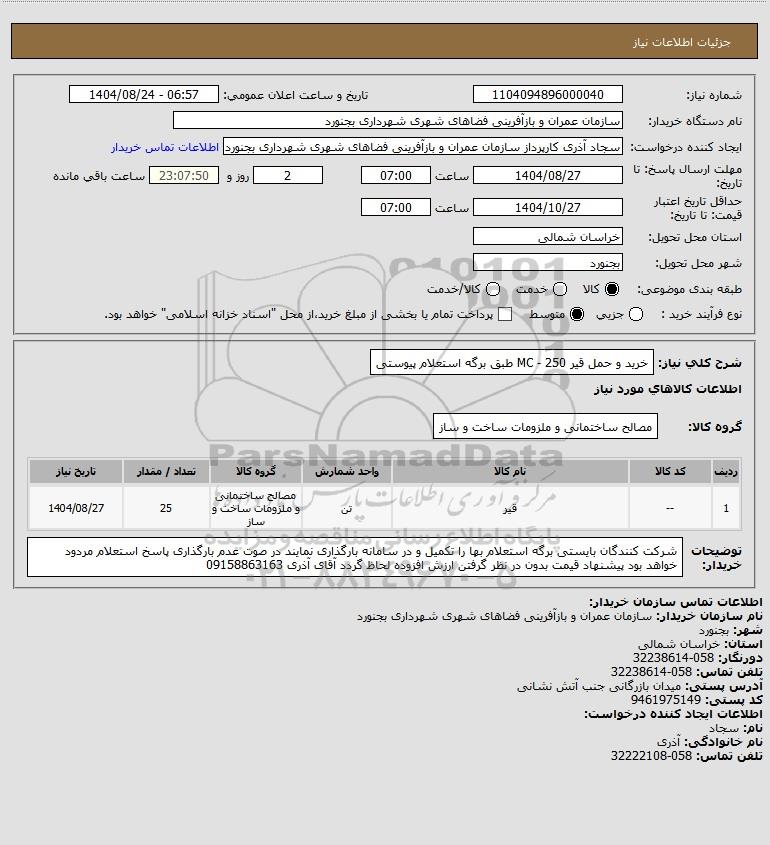 تلفن:5- 88349670 (021) فکس: 88349673 (021) Website: www.ParsNamadData.com E-mail: Info@ParsNamadData.com استعلام خرید و حمل قیر MC - 250 طبق برگه استعلام پیوستی