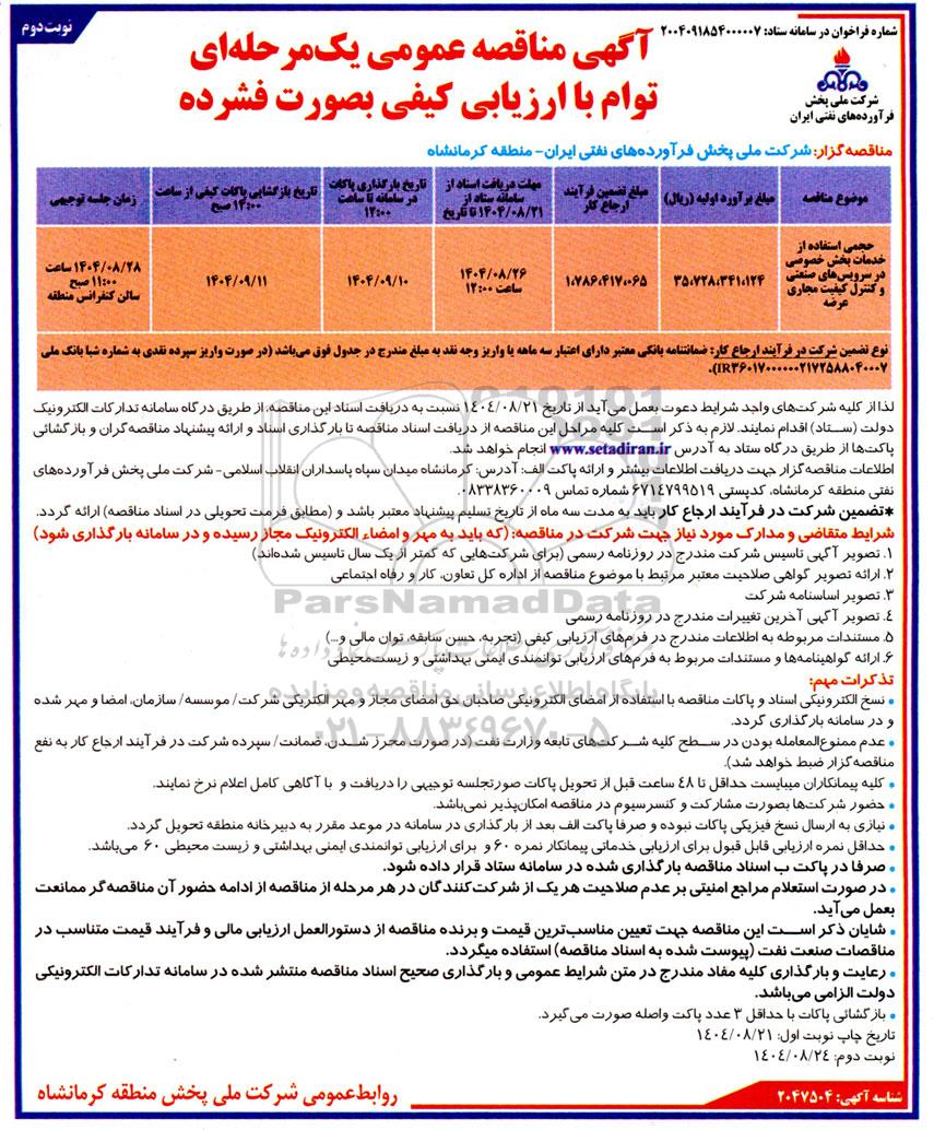 | عنوان آگهی: مناقصه حجم استفاده از خدمات بخش خصوصی در سرویس های صنعتی و کنترل کیفیت مجاری عرضه نوبت دوم |