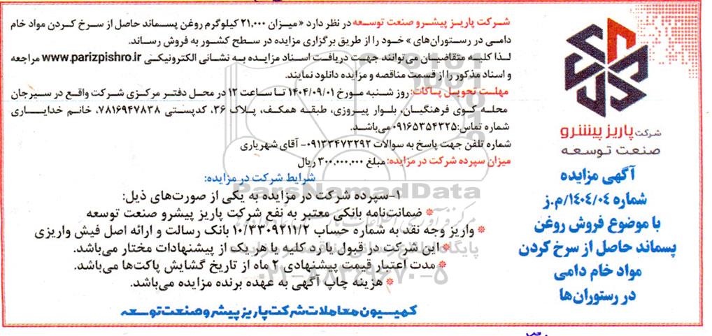 شرکت پاریز پیشر و صنعت توسعه در نظر دارد میزان تقریبی 21.000 کیلوگرم روغن پسماند حاصل از سرخ کردن مواد خام دامی در رستوران ها خود را از طریق برگزاری مزایده در سطح کشور به فروش رساند.