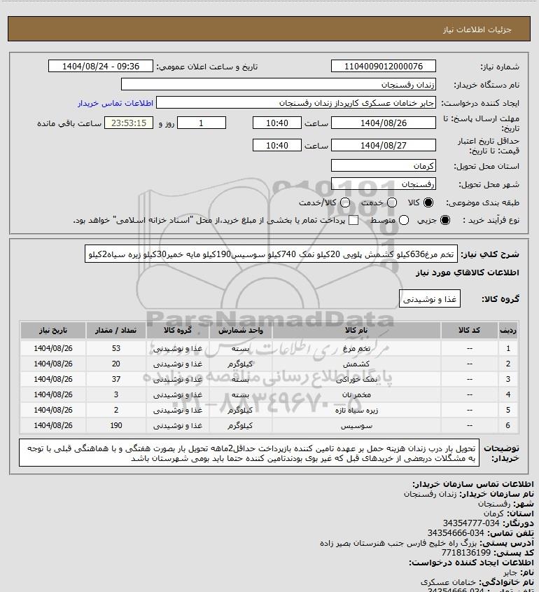 تلفن:5- 88349670 (021) فکس: 88349673 (021) Website: www.ParsNamadData.com E-mail: Info@ParsNamadData.com استعلام تخم مرغ636کیلو کشمش پلویی 20کیلو نمک 740کیلو سوسیس190کیلو مایه خمیر30کیلو زیره سیاه2کیلو