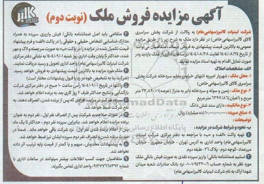 شرکت لبنیات کالبر (سهامی عام) به وکالت از شرکت پخش سراسری کالای کالبر (سهامی خاص) در نظر دارد ملک به شرح زیر را از طریق مزایده عمومی به بالاترین قیمت پیشنهادی به فروش برساند. متقاضیان می توانند از تاریخ 1404.08.24 لغایت 1404.08.28 در ساعات اداری از ملک بازدید و در صورت تمایل اقدام به تهیه اسناد مزایده نمایند.