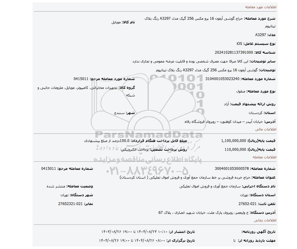 | عنوان آگهی: مزایده گوشی آیفون 16 پرو مکس 256 گیک مدل A3297 رنگ بلاک تیتانیوم |