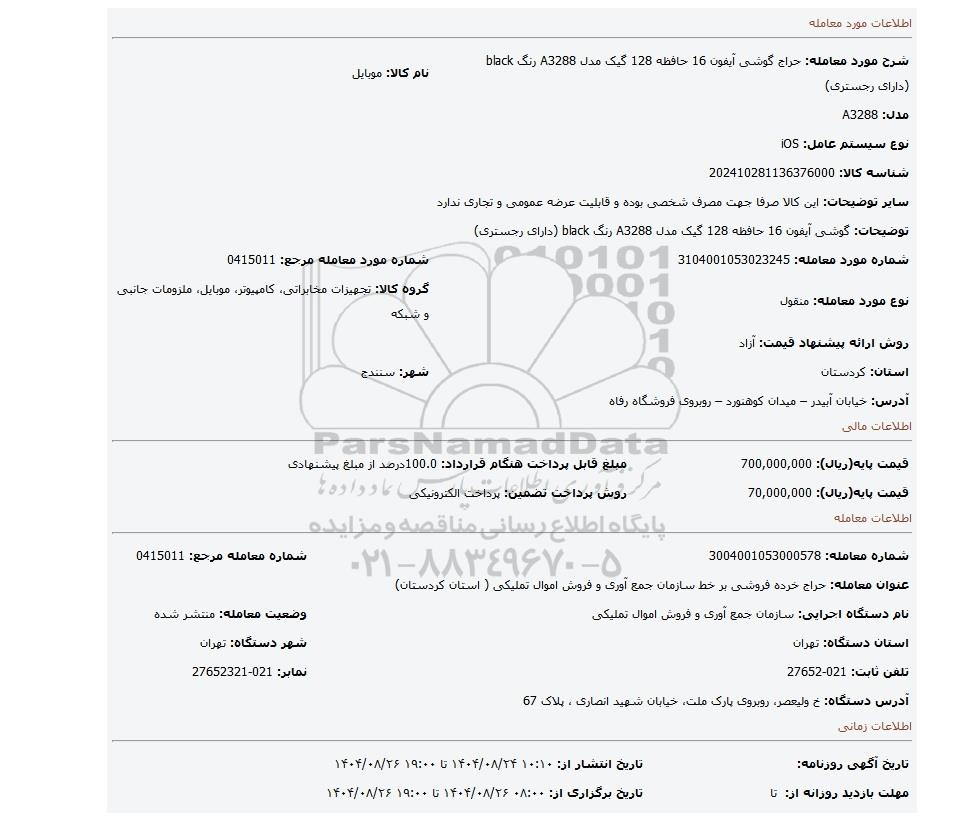 | عنوان آگهی: مزایده گوشی آیفون 16 حافظه 128 گیک مدل A3288 رنگ black (دارای رجستری) |