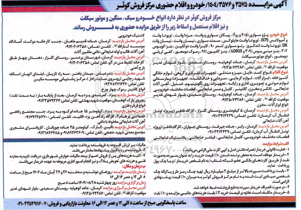 اگهی مزایده 3575 و 1404/3576/ خودرو و اقلام حضوری مرکز فروش کوثر