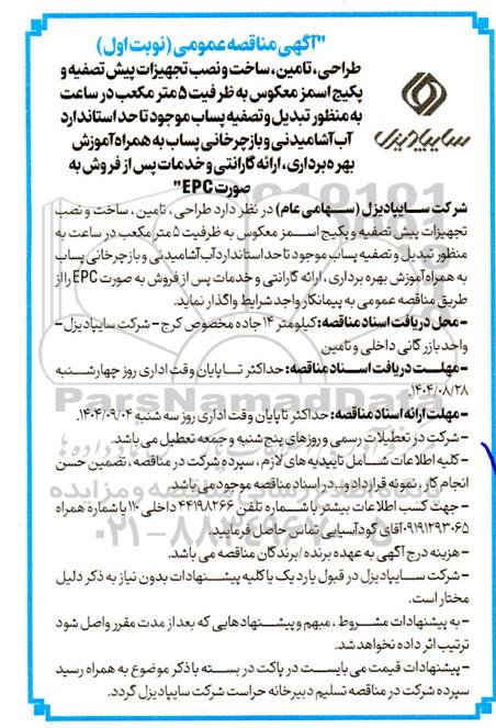 شرکت سایپا دیزل (سهامی عام) در نظر دارد طراحی، تامین، ساخت و نصب تجهیزات پیش تصفیه و پکیج اسمز معکوس به ظرفیت 5 متر مکعب در ساعت به منظور تبدیل و تصفیه پساب موجود تا حد استاندارد آب آشامیدنی و بازچرخانی پساب به همراه آموزش بهره برداری، ارائه گارانتی و خدمات پس از فروش به صورت EPC را از طریق مناقصه عمومی به پیمانکار واجد شرایط واگذار نماید.