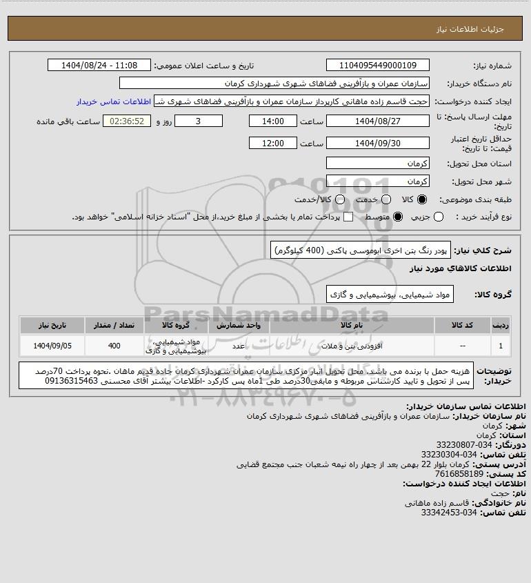 تلفن:5- 88349670 (021) فکس: 88349673 (021) Website: www.ParsNamadData.com E-mail: Info@ParsNamadData.com استعلام پودر رنگ بتن اخری ابوموسی پاکتی (400 کیلوگرم)