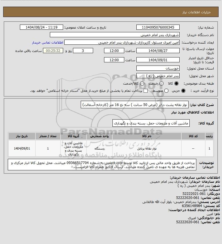 تلفن:5- 88349670 (021) فکس: 88349673 (021) Website: www.ParsNamadData.com E-mail: Info@ParsNamadData.com استعلام نوار نقاله پشت درایر (عرض 50 سانت ) سه نخ 16 متر (کارخانه آسفالت)