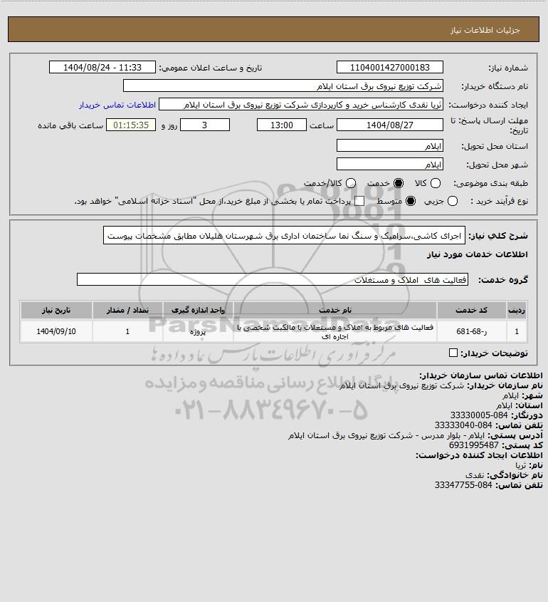 تلفن:5- 88349670 (021) فکس: 88349673 (021) Website: www.ParsNamadData.com E-mail: Info@ParsNamadData.com استعلام اجرای کاشیسرامیک و سنگ نما ساختمان اداری برق شهرستان هلیلان مطابق مشخصات پیوست