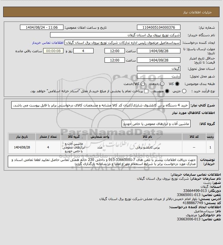 تلفن:5- 88349670 (021) فکس: 88349673 (021) Website: www.ParsNamadData.com E-mail: Info@ParsNamadData.com استعلام خرید 4 دستگاه پرس کابلشوی شارژی//ایران کد کالا مشابه و مشخصات کالای درخواستی برابر با فایل پیوست می باشد.