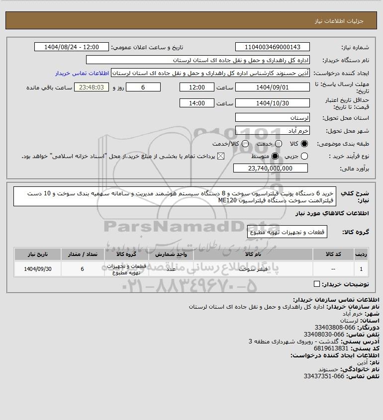 تلفن:5- 88349670 (021) فکس: 88349673 (021) Website: www.ParsNamadData.com E-mail: Info@ParsNamadData.com استعلام خرید 6 دستگاه یونیت فیلتراسیون سوخت و 8 دستگاه سیستم هوشمند مدیریت و سامانه سهمیه بندی سوخت و 10 دست فیلترالمنت سوخت دستگاه فیلتراسیون ME120
