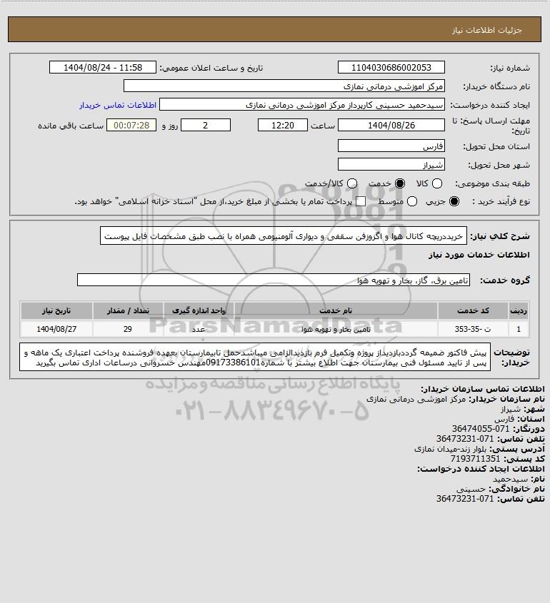 تلفن:5- 88349670 (021) فکس: 88349673 (021) Website: www.ParsNamadData.com E-mail: Info@ParsNamadData.com استعلام خریددریچه کانال هوا و اگزوزفن سقفی و دیواری آلومنیومی همراه با نصب طبق مشخصات فایل پیوست