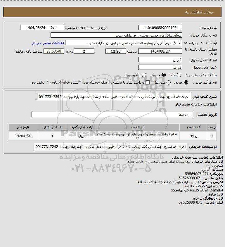 تلفن:5- 88349670 (021) فکس: 88349673 (021) Website: www.ParsNamadData.com E-mail: Info@ParsNamadData.com استعلام اجرای فنداسیون وشاسی کشی دستگاه لاندری طبق ساختار شکست وشرایط پیوست 09177317242