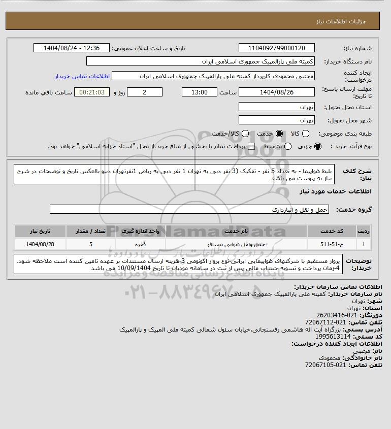 تلفن:5- 88349670 (021) فکس: 88349673 (021) Website: www.ParsNamadData.com E-mail: Info@ParsNamadData.com استعلام بلیط هواپیما - به تعداد 5 نفر - تفکیک (3 نفر دبی به تهران 1 نفر دبی به ریاض 1نفرتهران دبیو بالعکس