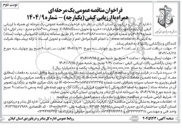 1- اداره کل بنادر و دریانوردی استان گیلان در نظر دارد فراخوان مناقصه عمومی یک مرحله ای همراه با ارزیابی کیفی( یکپارچه) جهت انجام قرارداد خرید و تحویل دستگاه X-RAY چمدانی 100*100 دو منبع بندر انزلی » با شماره (1404.9 )و شماره فراخوان « 2004003582000010 را از طریق سامانه تدارکات الکترونیکی دولت (ستاد) به آدرس سایت ستاد ایران ( با انجام کلیه مراحل اعم از دریافت و تحویل اسناد تا ارائه پیشنهاد شرکت کنندگان و بازگشایی پاکتها) به انجام رساند.