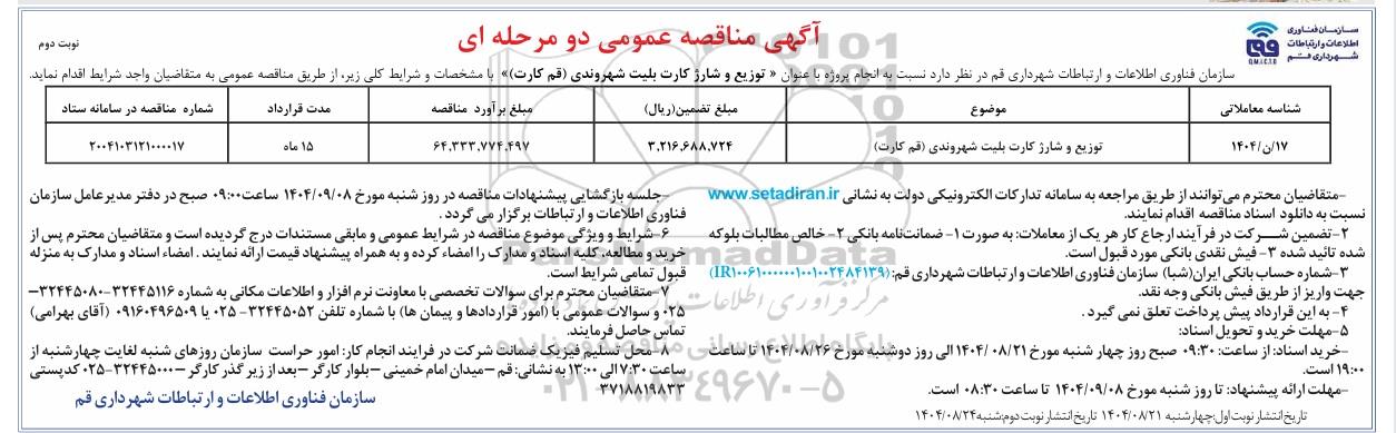 | عنوان آگهی: مناقصه توزیع و شارژ کارت بلیت شهروندی (قم کارت) - نوبت دوم |