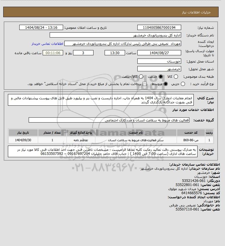 تلفن:5- 88349670 (021) فکس: 88349673 (021) Website: www.ParsNamadData.com E-mail: Info@ParsNamadData.com استعلام انجام معاینات ادواری سال 1404 به همراه چاپ اجاره داربست و نصب بنر و بیلبورد طبق فایل های پیوست