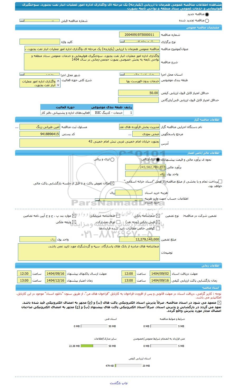 اطلاعات زمانی| مهلت دریافت اسناد | 1404/09/02 | ساعت | 12:00 | مهلت ارسال پاکتهای پیشنهاد | 1404/09/16 | ساعت | 12:30 | | زمان بازگشایی پاکت ها | 1404/09/16 | تا تاریخ | 13:00 | زمان اعتبار پیشنهاد | 1404/12/16 | تا ساعت | 13:00 |