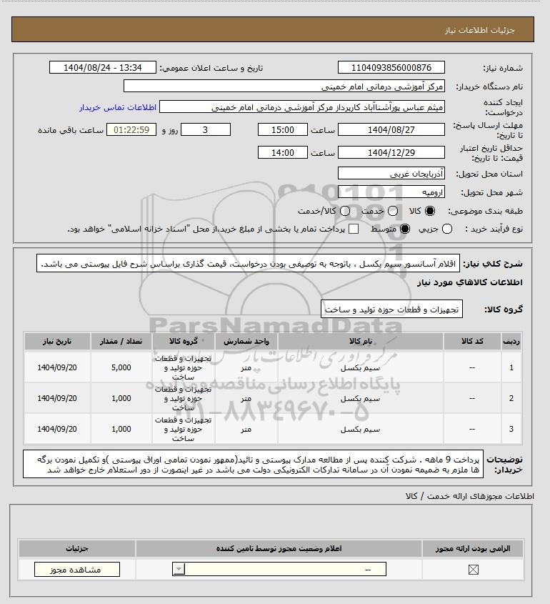 تلفن:5- 88349670 (021) فکس: 88349673 (021) Website: www.ParsNamadData.com E-mail: Info@ParsNamadData.com استعلام اقلام آسانسور سیم بکسل باتوجه به توصیفی بودن درخواست قیمت گذاری براساس شرح فایل پیوستی می باشد.