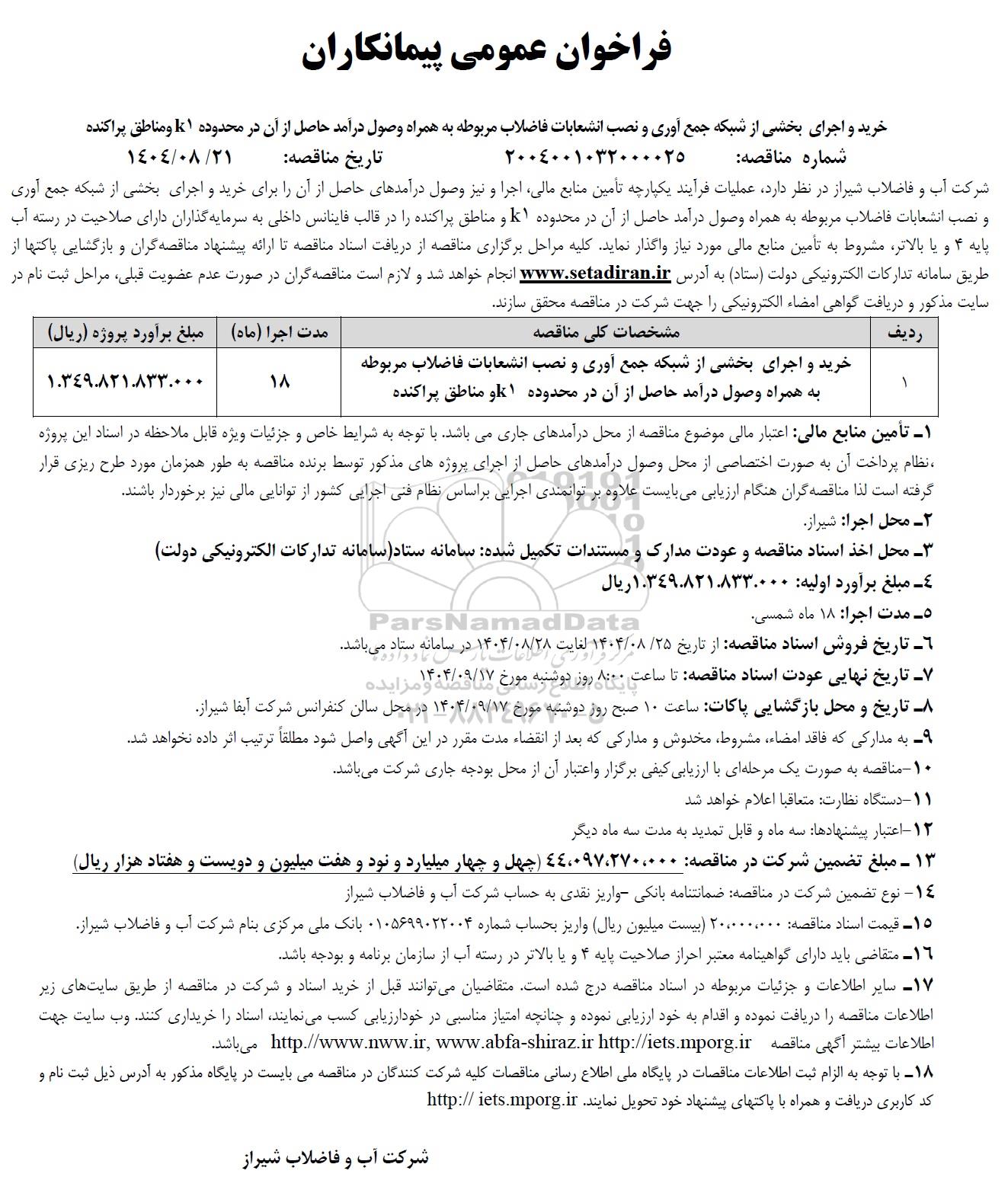 شرکت آب و فاضلاب شیراز در نظر دارد عملیات فرآیند یکپارچه تأمین منابع مالی اجرا و نیز وصول درآمدهای حاصل از آن را برای خرید و اجرای بخشی از شبکه جمع آوری و نصب انشعابات فاضلاب مربوطه به همراه وصول درآمد حاصل از آن در محدوده K1 و مناطق پراکنده را در قالب فاینانس داخلی به سرمایه گذاران دارای صلاحیت در رسته آب پایه 4 و یا بالاتر، مشروط به تامین منابع مالی مورد نیاز واگذار نماید کلیه مراحل برگزاری مناقصه از دریافت اسناد مناقصه تا ارائه پیشنهاد مناقصه گران و بازگشایی پاکتها از طریق سامانه تدارکات الکترونیکی دولت (ستاد) به آدرس ستاد ایران انجام خواهد شد و لازم است مناقصه گران در صورت عدم عضویت قبلی، مراحل ثبت نام در سایت مذکور و دریافت گواهی امضاء الکترونیکی را جهت شرکت در مناقصه محقق سازند.