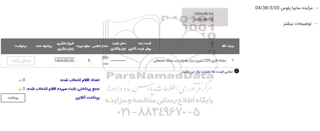 تلفن:5- 88349670 (021) فکس: 88349673 (021) Website: www.ParsNamadData.com E-mail: Info@ParsNamadData.com مزایده بشکه فلزی 220 لیتری درباز همراه درب بشکه ضایعاتی