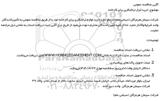 تلفن:5- 88349670 (021) فکس: 88349673 (021) Website: www.ParsNamadData.com E-mail: Info@ParsNamadData.com مناقصه خرید ابزار تراشکاری برای کارخانه