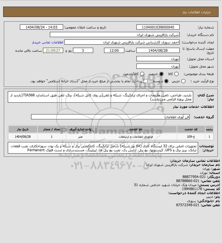 تلفن:5- 88349670 (021) فکس: 88349673 (021) Website: www.ParsNamadData.com E-mail: Info@ParsNamadData.com استعلام بازدید طراحی تامین ملزومات و اجرای ترانکینگ شبکه و تلفن(بر روی کابل شبکه) برق تلفن طبق استاندارد TIA568(بازدید از محل پروژه الزامی می باشد)