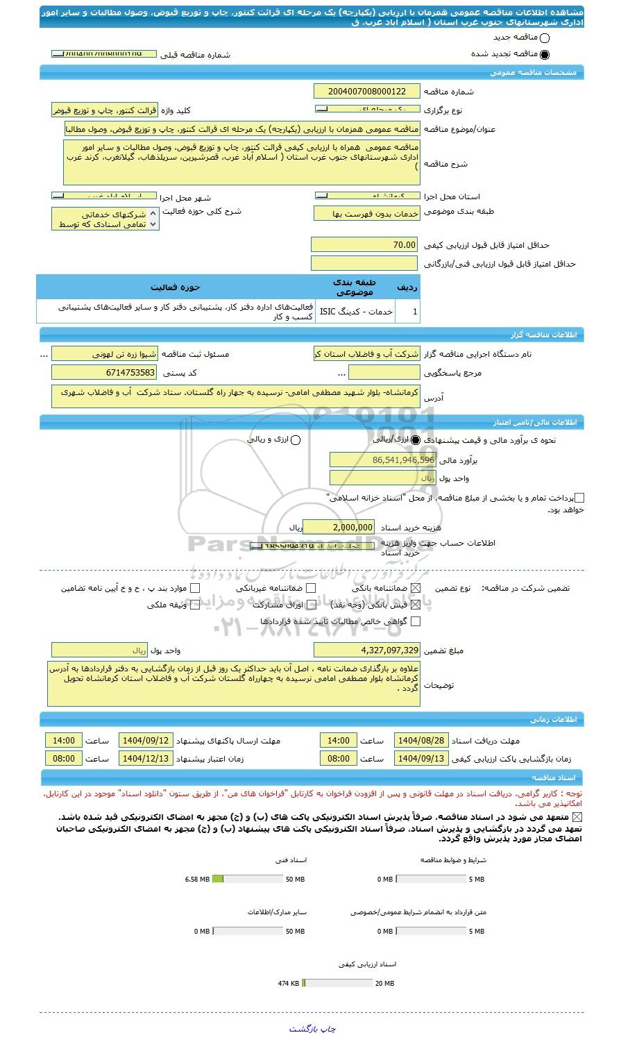 | عنوان آگهی: مناقصه مناقصه عمومی همزمان با ارزیابی (یکپارچه) یک مرحله ای قرائت کنتور چاپ و توزیع قبوض وصول مطالبات و سایر امور اداری شهرستانهای جنوب غرب استان ( اسلام آباد غرب ق |