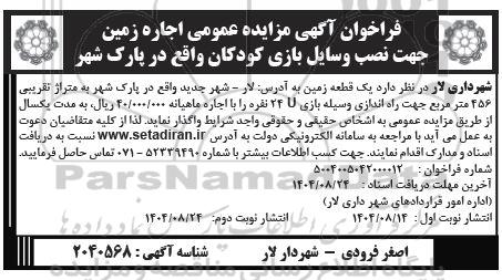 تلفن:5- 88349670 (021) فکس: 88349673 (021) Website: www.ParsNamadData.com E-mail: Info@ParsNamadData.com فراخوان مزایده اجاره زمین جهت نصب وسایل بازی کودکان - نوبت دوم