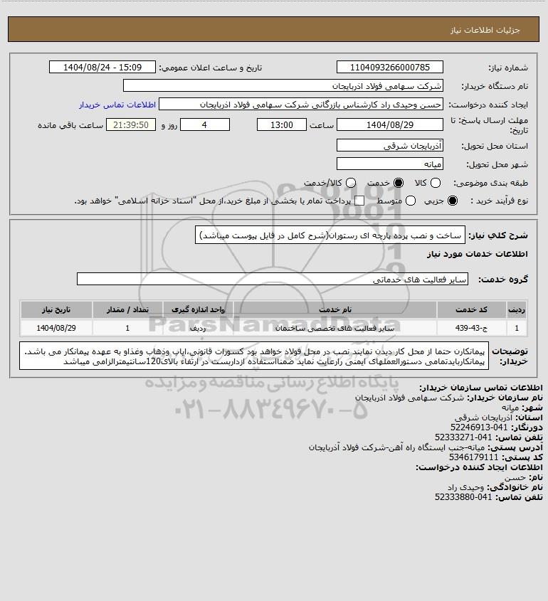 تلفن:5- 88349670 (021) فکس: 88349673 (021) Website: www.ParsNamadData.com E-mail: Info@ParsNamadData.com استعلام ساخت و نصب پرده پارچه ای رستوران(شرح کامل در فایل پیوست میباشد)