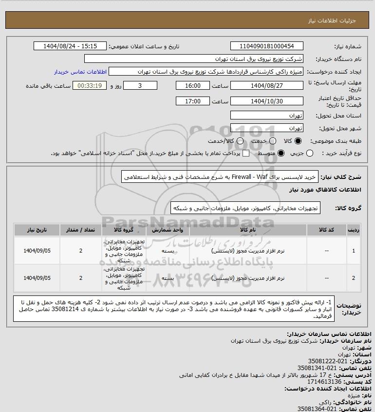 تلفن:5- 88349670 (021) فکس: 88349673 (021) Website: www.ParsNamadData.com E-mail: Info@ParsNamadData.com استعلام خرید لایسنس برای Firewall - Waf به شرح مشخصات فنی و شرایط استعلامی