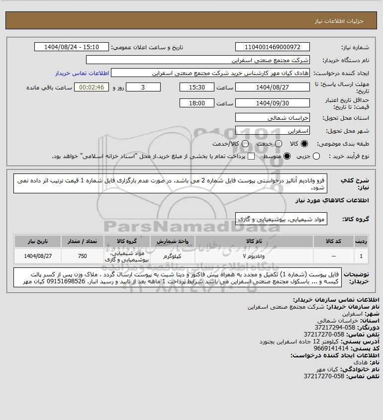 تلفن:5- 88349670 (021) فکس: 88349673 (021) Website: www.ParsNamadData.com E-mail: Info@ParsNamadData.com استعلام فرو وانادیم آنالیز درخواستی پیوست فایل شماره 2 می باشد. در صورت عدم بارگزاری فایل شماره 1 قیمت ترتیب اثر داده نمی شود.
